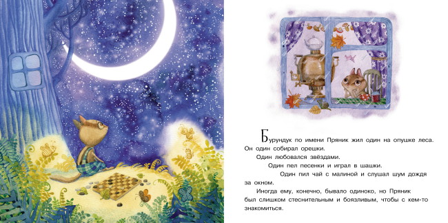 Рассмотрите иллюстрацию Олега Гончарова. Как хорош бурундук по имени Пряник! Он умеет любоваться звёздами. Какой он? Мечтательный (скажут дети). Он поёт песенки. Какой он? Музыкальный (и так скажут дети). А ещё он играет в шашки! О чём это говорит? Ой, а как же он играет один? (так могут сказать дети). И в этот момент у них – внимательных слушателей-читателей – рождается идея помочь бурундуку Прянику обрести друга! Наверное, именно это замыслила Ирина Зартайская, создавая своих сказочных героев.