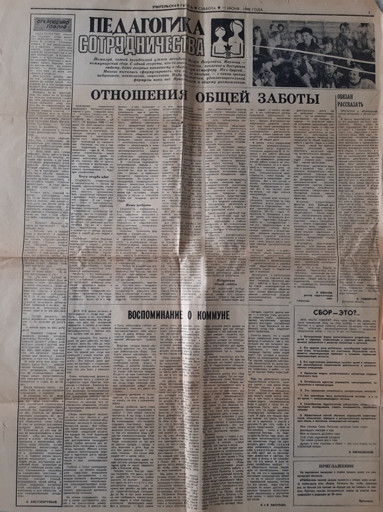 Материал, который мы публикуем сегодня – из далекого 1988 г. Из той «Учительской газеты», которая жила свободой, творчеством, новаторством. Во главе которой стояли и в которой работали коммунары. Не по возрасту, а по душе.