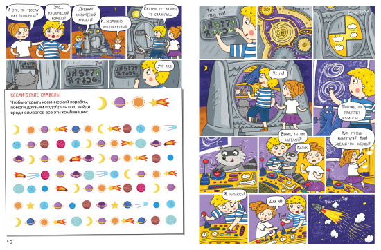 Еще один пример удачного комикса – это серия «Суперквест для ума». Она выросла из поиска баланса: мы хотели найти форму, которая будет интересна и полезна современным детям. Детскому психологу Маше Агапиной удалось соединить в тетрадях приемы сторителлинга, дидактические игры, поделки и развивающие задания именно благодаря комиксам.
