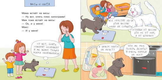 Получились очень смешные истории о волшебном доме, в котором разговаривают кастрюли и сковородки, двери и окна, столы и стулья. Взрослые ходят на работу, дети играют, ссорятся и мирятся, собака радуется вкусным косточкам, а кот – просто наблюдает…