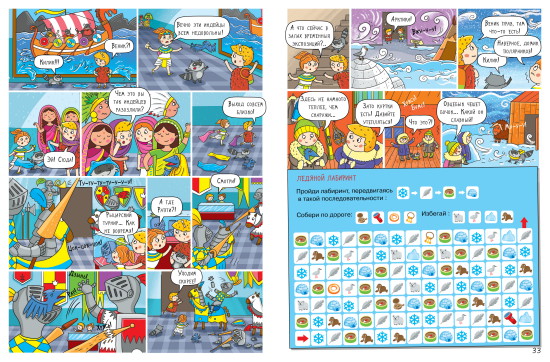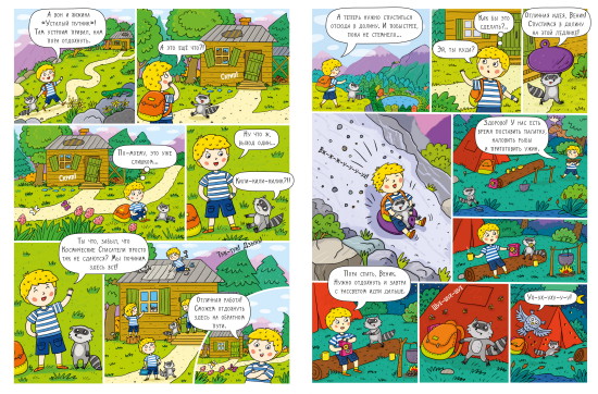 Комиксы стали стержнем каждой тетради, и это не просто истории в картинках, а отличный логический материал, с эмоциональными и конфликтными моментами, с сильной познавательной составляющей. Комикс перебивается заданиями, что очень нравится современным детям. Ведь они рождаются с гаджетами в руках и привыкли к быстрой смене картинок и информации. Очень похоже на настоящее путешествие с привалами.