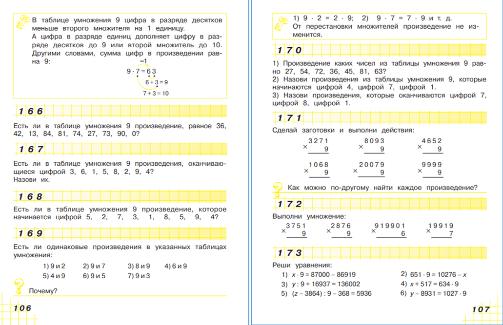 К примеру, последовательность изучения таблиц умножения такова: умножение 0 и 1 на любое число, а значит и на 10, 100, 1000 и так далее, затем умножение 9 (девяти, а не на 9), 2 (двух, а не на 2), 5, 6, 4, 8, 3 и 7. Переместительное свойство умножения позволит и обратное умножение на 9, 2, 5 и так далее.
