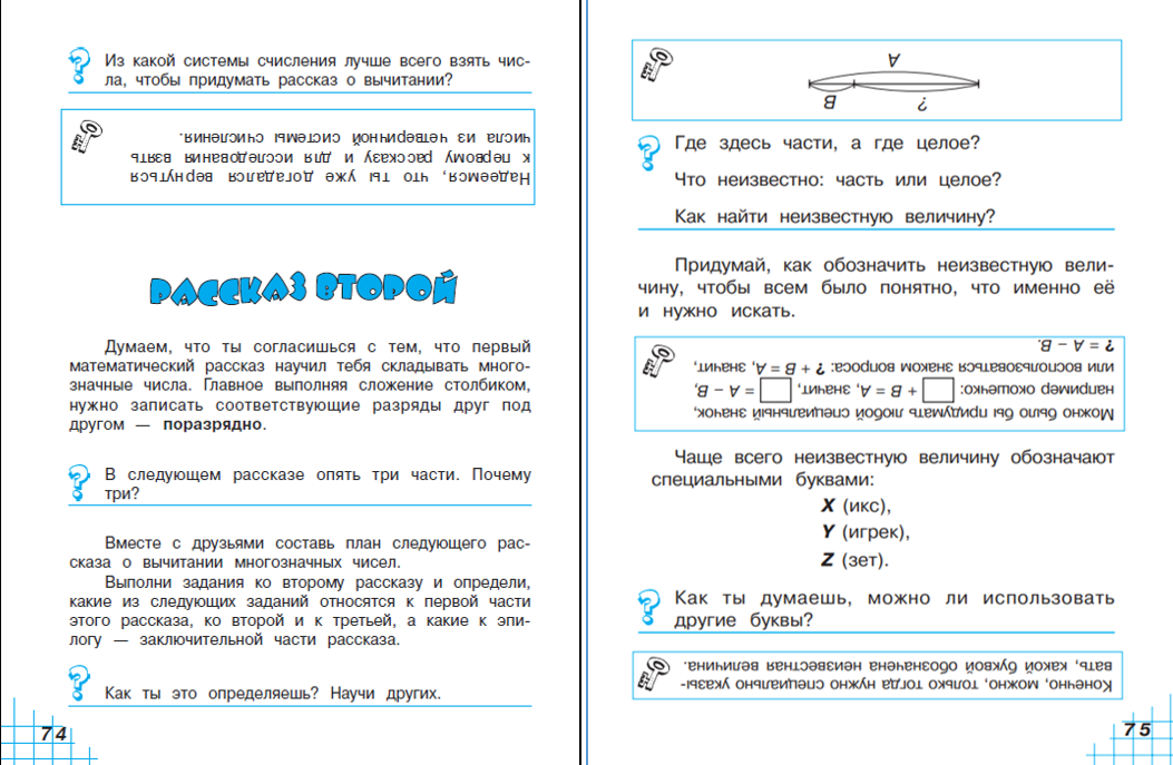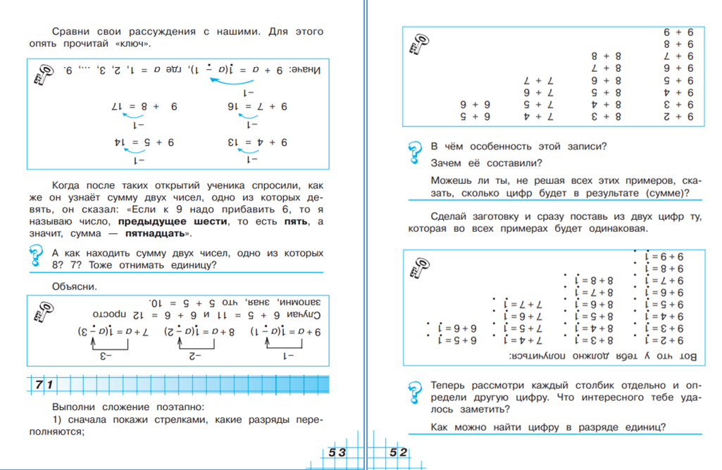Если ребёнок откроет для себя общий принцип поразрядности, хотя анализировать будет сложение многозначных чисел, то ему для их сложения тем более будет неважно, сколько знаков в числах-слагаемых. Этот общий принцип поразрядности и построенный ими алгоритм выполнения действия сложения (а он отличается от привычного!) они перенесут и на остальные арифметические действия с многозначными числами. Согласитесь, что такие открытия при участии учителя как организатора исследования дают возможность ребёнку испытать те же чувства, которые испытывает ученый, сделавший открытие.