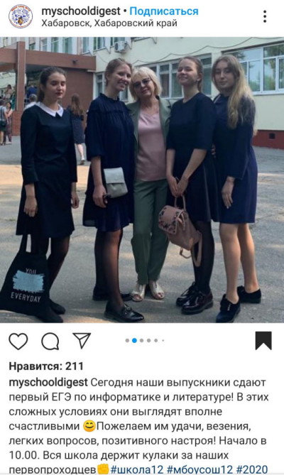 На Дальнем Востоке выпускники начали заполнять бланки ЕГЭ и приступили к работе, пока запад страны еще спал. Судя по постам в Инстаграм, в Хабаровске строгое соблюдение профилактики коронавируса оставили для отчетов и протокольной съемки. На неформальных снимках соскучившиеся друг по другу за время онлайн-обучения выпускники и педагоги грешат несоблюдением дистанции. Свеженанесенной разметки явно никто не замечает. Впрочем, масок и перчаток тоже не наблюдается.