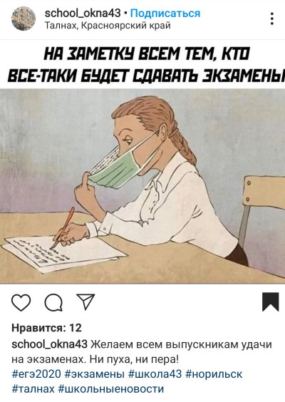 Забавным, но все-таки вредным советом отличилась в своем Инстаграм-аккаунте талнахская школа № 43 на севере Красноярского края. Автор поста пожелал выпускникам ни пуха, ни пера и продемонстрировал двойное назначение маски, которая не только защитит выпускника от вируса, но и надежно спрячет шпаргалки.