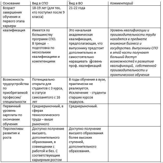 По совокупности оценок оснований выпускник СПО обладает несколько большей маневренностью и комфортностью для успешного и устойчивого карьерного старта.