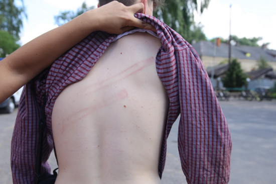 Спустя некоторое время выводят еще одного парня. Его зовут Матвей, ему нет 18 лет. К нему подбегает мама. Парень говорит, что с ним все в порядке, но рубашка и майка с пятнами крови говорят об обратном. На его лице ссадины, побит нос. На спине – мама все-таки задрала рубашку, чтобы осмотреть сына – два следа от дубинок. А еще Матвей прихрамывал. Парень успокаивает мать и говорит, что все в порядке. Вместе они поехали в травмпункт.
