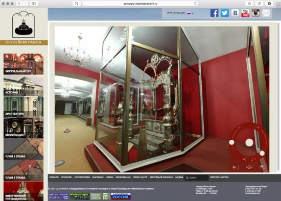 На сайте музеев Кремля можно отправиться в виртуальный тур по любому выбранному музею. Вспомнить названия кремлевских соборов и заглянуть внутрь под патетическое музыкальное сопровождение, даже физическое посещение музеев Кремля может не вызвать такой концентрации и благоговения. Если это понравилось, тогда стоит обратиться к разделам виртуальных туров panotours.ru и culture.ru, где можно посетить не один десяток музеев больших и малых городов России