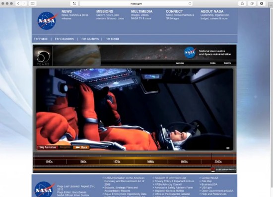 Поклонникам космической тематики нельзя пройти мимо виртуального проекта, посвященного истории всемирно известного космического агентства США. Запуск ресурса был приурочен к пятидесятилетнему юбилею организации в 2008 году. Помимо успехов американской космонавтики здесь довольно наглядно показаны технические детали космического кораблестроения и запуска космических аппаратов, а добродушный робот сориентирует, на что кликать дальше.