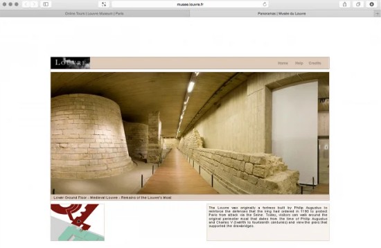 Лувр не представлен в культурном проекте Google (о котором речь шла выше), предпочитает развивать собственную онлайн-платформу. На своем сайте музей позволяет прогуляться по нескольким залам. Подножия стен королевского дворца на первом этаже музея, зал с реликвиями античности и Древнего Египта можно увидеть в виде виртуальной панорамы.