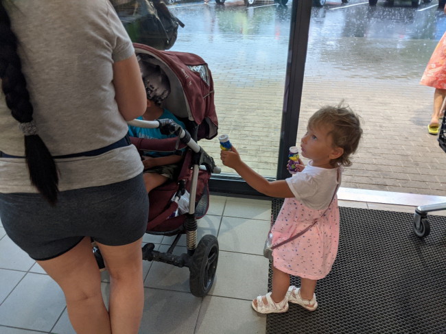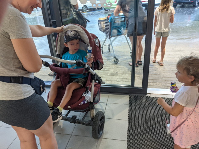 Был жаркий летний день. Внезапно начавшийся ливень застал покупателей врасплох. Люди стоят в буферной зоне магазина, пережидают, пока дождь стихнет. Мальчик, сидящий в коляске, испугался грозы и заплакал. И тут к нему подходит девочка (подосланная папой) и протягивает бутылку питьевого йогурта. Мальчишка взял йогурт, выпил его, успокоился и заулыбался. И все люди, пережидающие дождь, тоже заулыбались.