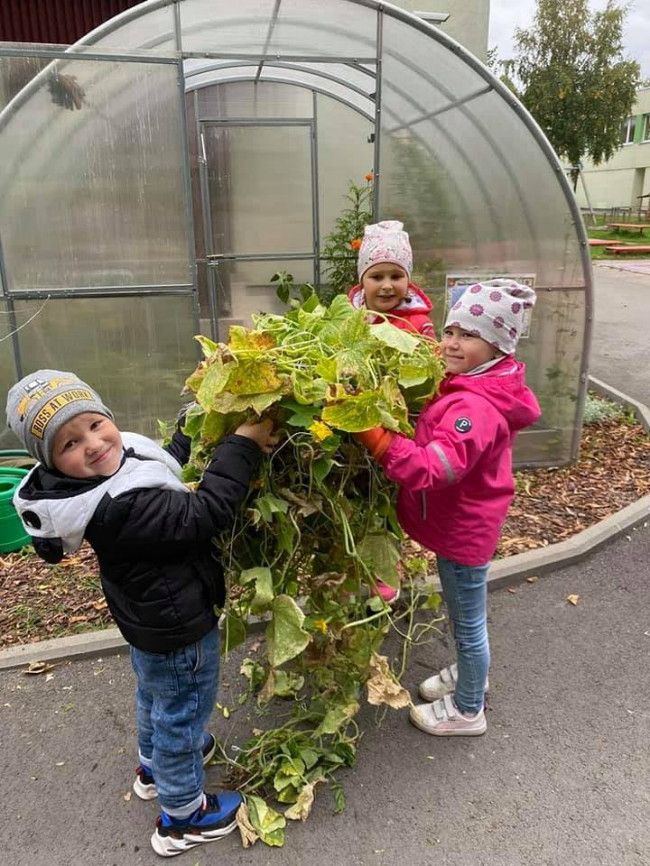 Он просуществовал два года. Когда кроватки утилизировали, их заменили списанными шкафчиками. Осенью листья из сада не вывозят, а складывают в грядки. К весне листья полуперегнивают, к ним досыпают землю, и на этой подушке хорошо растет урожай. Главная тема детского огорода – биоразнообразие. Дети с интересом наблюдают, как в огороде растут два вида свеклы и три вида петрушки. С помощью родителей во дворе садика установили сливную систему с дождевой водой, поэтому теперь нет проблем с поливом. В детсадовском огороде вырастили землянику, клубнику, картошку, лук, морковку, щавель и тыкву. Осенью дети вместе с воспитателями собрали урожай и организовали выставку для родителей. А потом все экспонаты выставки передали на кухню.