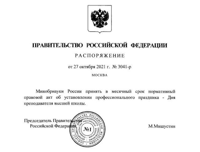 Премьер-министр РФ Михаил Мишустин поручил в течение месяца принять документ, который установит в России профессиональный праздник для преподавателей высшей школы. Соответствующее распоряжение главы кабмина опубликовано в пятницу на официальном сайте правовой информации.
