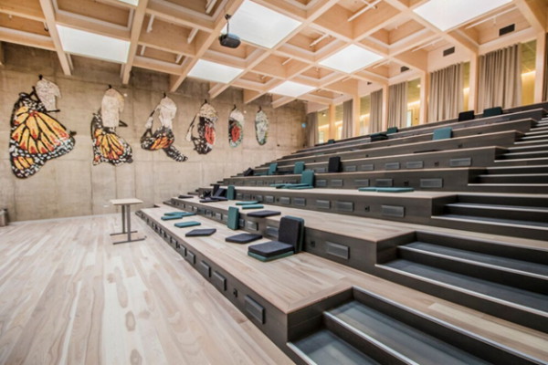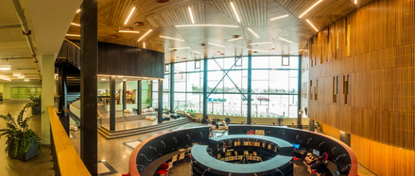 Крыша здания – смотровая площадка, с которой открывается живописный вид на город. Там есть места для отдыха и учебы, а еще телескоп и приборы для погодных наблюдений. Внутри школы созданы все условия для поддержания активного образа жизни детей: дорожки для прогулок, площадки для игр и лазания. В центре здания расположен атриум со ступенями, на которых можно и отдыхать, и учиться, и проводить мероприятия. Вместо библиотеки по всей школе расставлены полки с книгами, которыми могут пользоваться все желающие.