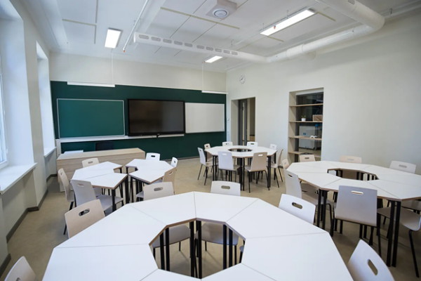В классах нестандартное решение столов – здесь нет рядов парт, вместо них – круглые или полукруглые столы. Такое решение помогает избежать деления детей на отличников, сидящих за первыми партами, и двоечников «на камчатке», а еще способствует вовлечению всех учеников в групповые и проектные работы.