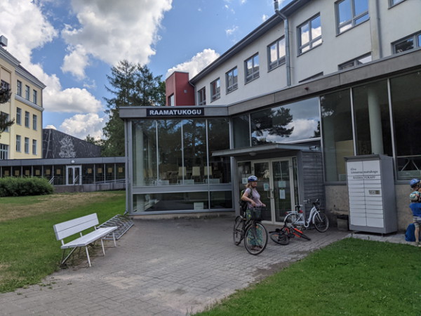 Но – на книгочея и книгохранилище бежит – после прогулки ноги сами вынесли меня к сооружению необычной архитектуры со стеклянной галереей, соединяющей несколько пространств. Уже издали углядев на фасаде знакомое длинное слово Linnaraamatukogu, я поняла, что передо мной – привычно выделяющееся, куда бы ты ни приехал, здание местной библиотеки; но вот сценка, случайно подсмотренная у входа, совсем не была привычной.