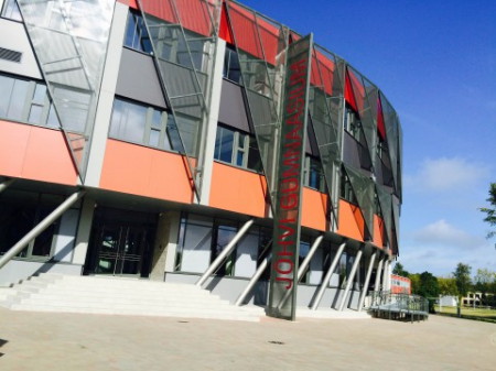 На фотографии заметно, что новое здание библиотеки совмещено стеклянной галереей со старым зданием школы. Они составляют единое целое, куда входит и спортивный комплекс (он виден на следующей фотографии – черный, с зеркальными вставками по периметру куб, примыкающий к левому крылу здания). Необычное архитектурное решение воплощает в себе новую концепцию школы как мультифункционального образовательного кластера, в котором объединены в единое целое учебные корпуса, библиотека, спортивный комплекс и молодежный центр.