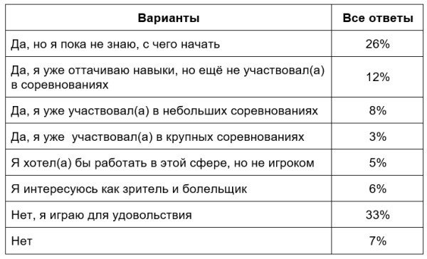 Вопрос был задан тем, кто ответил: «Я интересуюсь как зритель и болельщик», «Нет, я играю для удовольствия» и «Нет» на вопрос № 1.