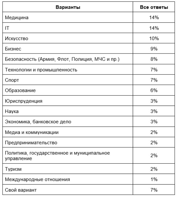 У школьников, которые ответили, что увлечены играми ради удовольствия, и у тех респондентов, что не интересуются играми, исследователи узнали, в какой профессиональной сфере они видят себя в будущем. Первое место среди ответов делят между собой медицина и IT (по 14% ответов). Каждый десятый из этой категории опрошенных видит себя в будущем в сфере искусства, чуть меньше (9%) – в бизнесе. Сферой безопасности (армия, флот, полиция, МЧС и пр.) интересуются 8% опрошенных. Пятерку самых популярных ответов замыкает сфера технологии и промышленности (7%).