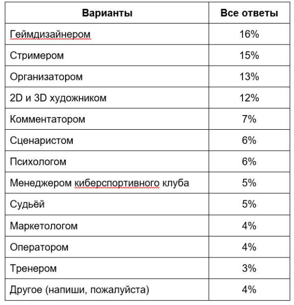 Вопрос был задан тем, кто ответил: «Я хотел(а) бы работать в этой сфере, но не игроком» на вопрос № 1.
