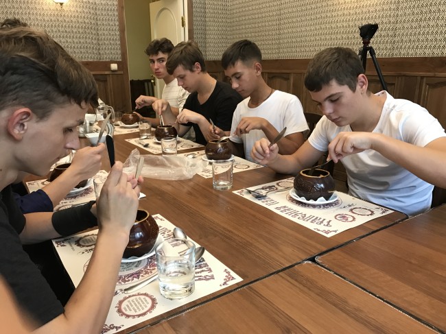Нас очень вкусно накормили в трапезной палате: просто божественный суп-пюре из белых грибов, честно говоря, я, работая в ресторане, не ел такую вкуснятину. А на второе нам давали картошку, запеченную с форелью в горшочке. Такая вкуснота. А на десерт – вкусное мороженое с чаем. Большое спасибо Лидии Геннадьевне за такой вкусный обед.