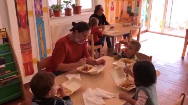 Пища в саду привозная, в индивидуальных контейнерах. Воспитатели обедают за одним столом вместе с детьми.