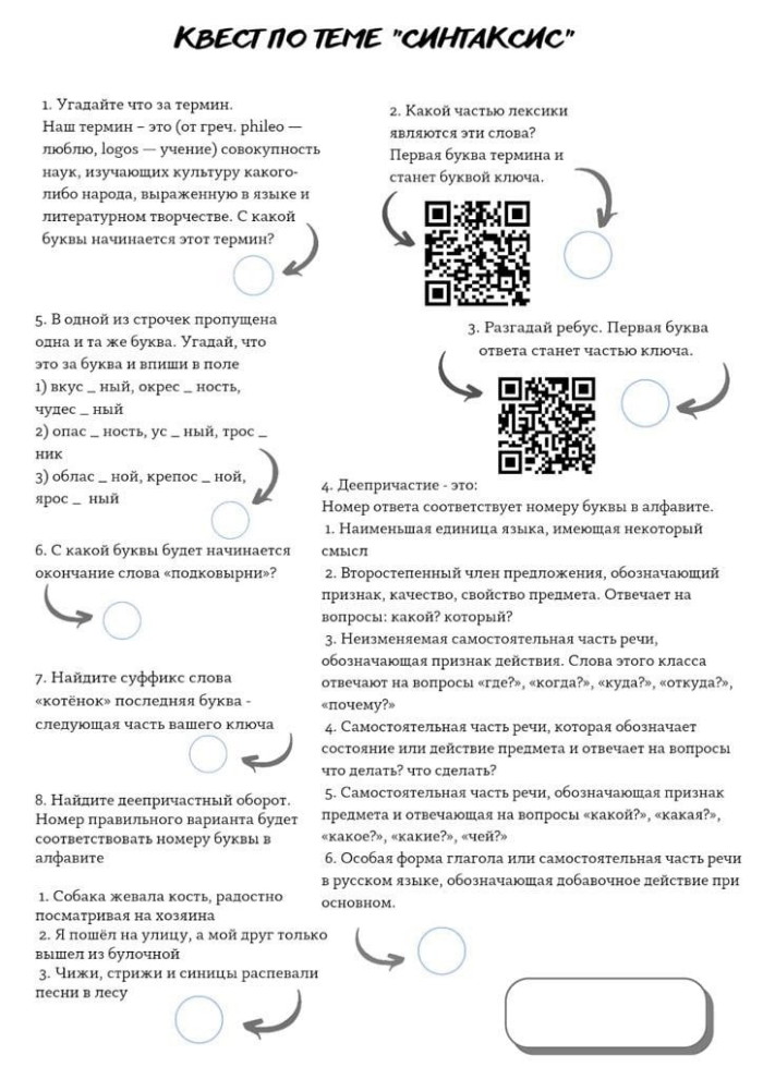 Перед нами стояла задача придумать квест по русскому языку. Он должен был быть красочным, интересным и понятным для всех. Сами задания могут представлять собой вопросы, ребусы, загадки, зашифрованные послания, решив которые, ребята получали заветные буквы. Именно их нужно было записать в выделенном поле, чтобы получить загаданное слово.