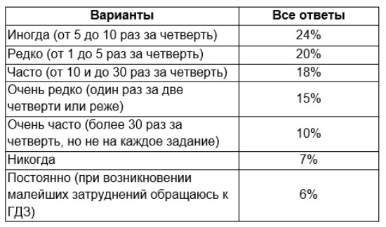 18% респондентов признались, что делают это часто (от 10 до 30 раз за четверть). Каждый пятый ученик прибегает к ГДЗ от 1 до 5 раз в течение учебной четверти, а почти каждый четвертый (24%) – от 5 до 10 раз. 6% школьников обращаются к готовым ответам постоянно.