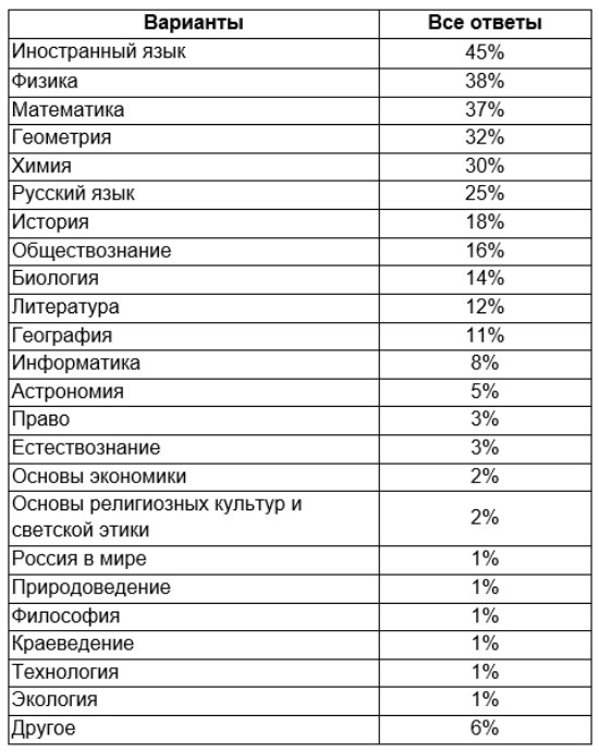 Чаще всего школьники списывают задания по иностранному языку (45%), физике (38%) и математике (37%). Чуть меньше респондентов пользуются готовыми решениями для заданий по геометрии (32%) и химии (30%). Русский язык периодически списывает каждый четвертый школьник, а историю – почти каждый пятый (18%). Остальные ответы распределились следующим образом.
