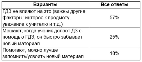 Больше половины школьников уверены, что ГДЗ не мешают получению знаний, а важны при этом другие факторы, такие как интерес к предмету, уважение к учителю и т.п. Каждый четвертый ученик признается, что при использовании ГДЗ быстро забывает новый материал. Напротив, 18% респондентов считают, что использование ГДЗ помогает запомнить и усвоить новые знания.