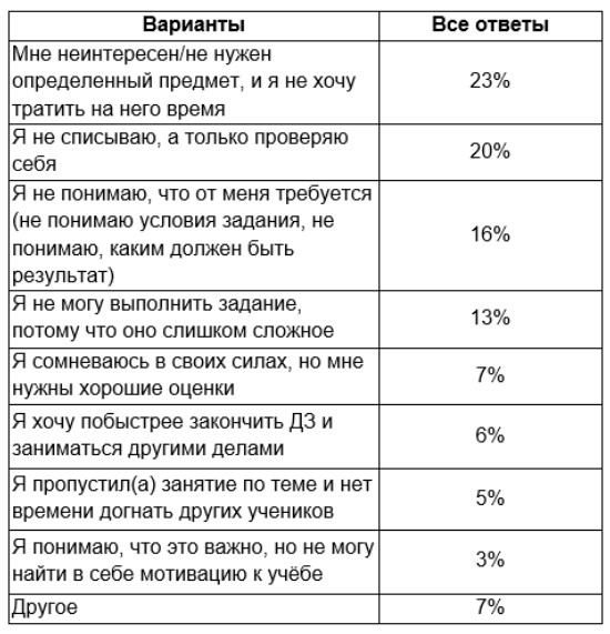 Большинство школьников (23%) списывают определенный предмет потому, что он им неинтересен или не нужен. Каждый пятый респондент ответил, что пользуется ГДЗ для самопроверки. Ещё 16% опрошенных признались, что делают это, потому что не понимают условия задания и то, каким должен быть результат. Если задание слишком сложное, то к решебникам и специальным сайтам прибегают 13% опрошенных. Сомневаются в своих силах, но хотят получить хорошую оценку, а потому используют ГДЗ – 7% школьников. Остальные ответы распределились следующим образом.