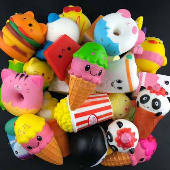 Сквиши (с англ. squishy – «мялка». – Прим. ред.) могут быть любого размера и формы. Главное – сквиши должно быть приятно мять. Обычно встречается три вида сквиши: резиновые, похожие на лизунов, вспененные, больше напоминающие губку, и круглые прозрачные, наполненные цветным гелем – он забавно растекается в разные стороны или собирается в симпатичные кляксы в стороны, когда жмешь на игрушку.