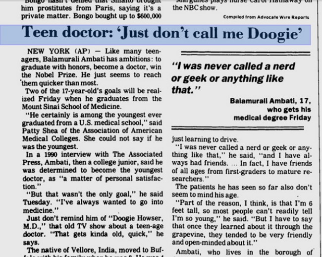 «Меня никогда не называли гиком или ботаником или еще как-то наподобие», – рассказывал Баламурали в интервью одному из старейших техасских изданий «Виктория Адвокат». Он очень просил не сравнивать его с «доктором Дуги», потому что, независимо от возраста, пациенты должны воспринимать его как врача, профессионала, а не обсуждать старые подростковые шоу.