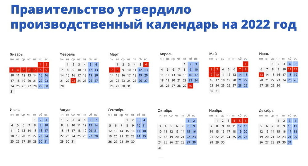 Также выходными будут 23 февраля, 6–8 марта (суббота 5 марта будет рабочим днем), 11–13 июня и 4–6 ноября.