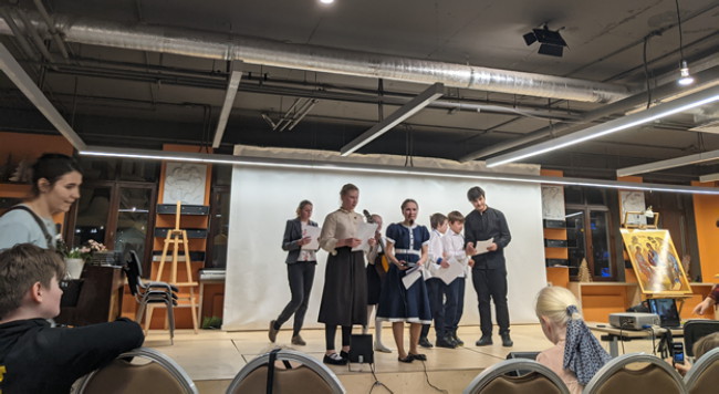 Рассказы о важных школьных событиях чередовались с выступлениями школьного ансамбля, а потом дети представили поэтический спектакль по стихам поэтов Серебряного века. Особенно органично звучали стихи Маяковского и Гумилева в исполнении мальчиков.