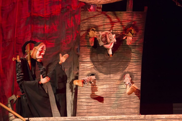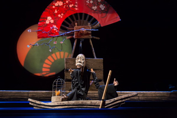 И декорации представляют собой смесь «китайского с венецианским»: куклы перемещаются по сцене в гондолах, но приветствуют друг друга по-китайски; девушка – служанка Турандот – наливает всем участникам спектакля национальный китайский напиток – чай, а между тем декорация на передней части сцены напоминает старинный европейский город, в окошки которого выглядывают герои в масках комедии дель арте.