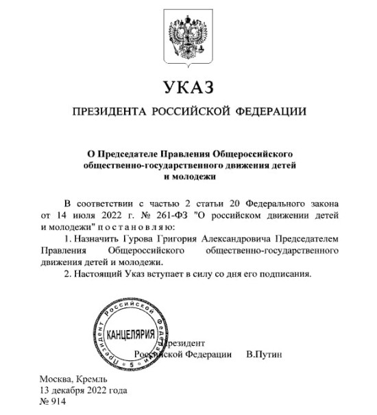 Президент РФ Владимир Путин назначил Григория Гурова председателем правления Общероссийского общественно-государственного движения детей и молодежи. Указ главы государства опубликован во вторник на официальном портале правовой информации.