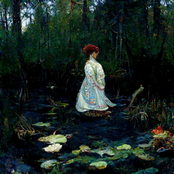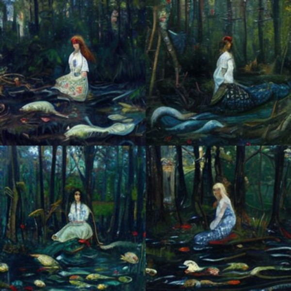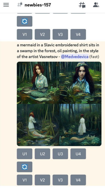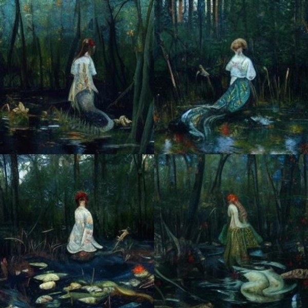 Мое хобби – масляная живопись. И я, как многие самоучки, часто делаю копии мастеров, чтобы почувствовать и понять нюансы. В нейросети я решила сгенерировать референс для своей будущей работы, взяв за основу любимого сказочного персонажа (русалку) и сложную технику (реализм крупными васнецовскими мазками). Сразу стоит оговориться, что получить картинку, которую вы нарисовали у себя в голове, да еще и в нужном стиле (и чтобы этот стиль сохранялся от запроса к запросу), очень сложно, а иногда вообще невозможно. Для этого точно нужен определённый навык построения текста, который надо постоянно развивать. И желательно, чтобы язык текста был английским.