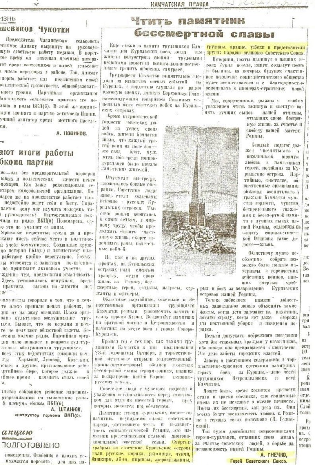 Ниже мы приводим его статью в газете «Камчатская правда» в одном из ноябрьских номеров 1946 года. Одним словом, айны принимали участие в боевых действиях при освобождении Курильских островов.