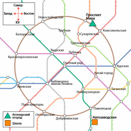 Например, пятиклассникам, пользуясь схемой метро на рисунке, предлагается определить, на какой станции метро пассажирам лучше всего сделать пересадку при поездке от станции метро «Автозаводская» до станции метро «Проспект Мира» так, чтобы число станций, которые проезжают пассажиры, было наименьшим.