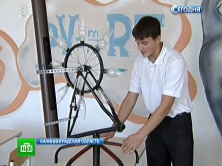 Свою мини-электростанцию юный Кулибин собрал из подручных средств, и это устройство обошлось ему всего лишь в 80 рублей. Принцип работы системы прост: дождевая вода устремляется по водостоку на лопасти, созданные из пластмассовых бутылок, и заставляет вращаться велосипедное колесо. Кинетическая энергия преобразуется в электричество через небольшой генератор.