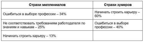 Одним из главных страхов и у зумеров (40%), и у миллениалов (34%) – ошибиться в выборе профессии. Кроме того, каждый четвертый (25%) миллениал беспокоится, что не будет дотягивать до требований работодателей по знаниям и навыкам, поэтому выбирает продолжать обучение. В то время как среди опрошенных зумеров никто не выбрал этот вариант.