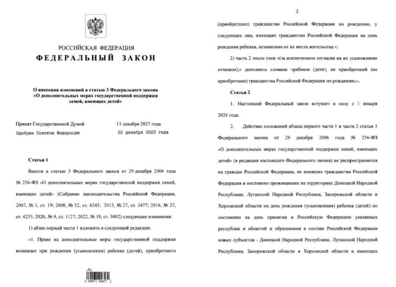 Согласно документу, жителям новых регионов – Донецкой и Луганской народных республик, Запорожской и Херсонской областей – будут выплачивать маткапитал независимо от основания и сроков приобретения российского гражданства.