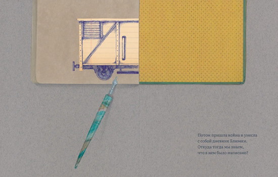 А на последней странице – вагон товарного поезда, в котором детей вместе с их воспитателями увезли в концлагерь. Он из той же линованной бумаги. В рифму с линейками листа – линейки вентиляционной решетки в верхнем углу вагона.
