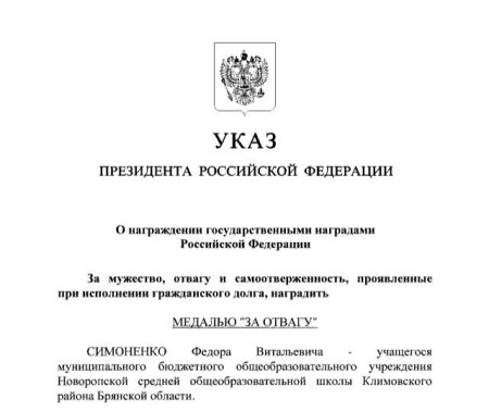 Президент России Владимир Путин подписал указ о награждении медалью «За отвагу» 10-летнего Федора Симоненко, спасшего двух других детей во время нападения украинских боевиков в Брянской области. Документ опубликован на официальном портале правовой информации в понедельник.
