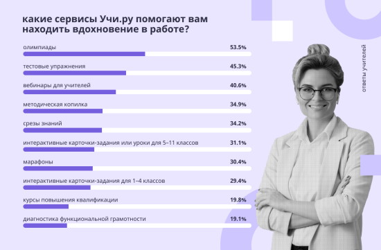 Среди инструментов и сервисов образовательной платформы Учи.ру, которые помогают учителям вдохновлять себя и школьников на развитие, педагоги отмечают: олимпиады (53%), тестовые упражнения (45%), вебинары для педагогов (40%), срезы знаний по русскому языку и математике (34%), методическую копилку (35%), интерактивные карточки для учеников 1–4 и 5–11 классов (30%).