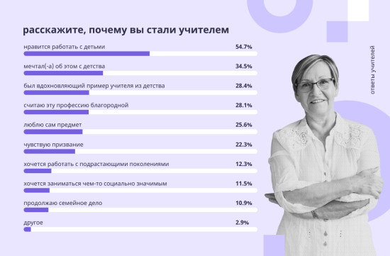 Согласно его данным, более половины опрошенных (54%) выбрали профессию учителя, поскольку их привлекала работа с детьми. Для 34% работа в школе педагогом была мечтой детства. Более четверти ответили, что на их выбор повлияли пример учителя (28%), благородство профессии (28%) и любовь к самому предмету (25%). 10% респондентов отметили, что продолжают семейное дело.