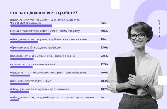 В вопросе о том, что именно вдохновляет учителей в их работе, популярными ответами стали – успехи учеников в школе (42%) и интерес детей к учебе (40%). 28% учителей черпает вдохновение из возможности наблюдать достижения своих подопечных во взрослой жизни.