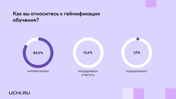По результатам опроса, большинство респондентов (84,5%) положительно относятся к геймификации обучения. При этом 13,5% затрудняются ответить на вопрос, а отрицательно относятся к термину лишь 2% опрошенных.