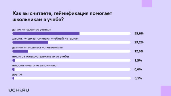 Им интереснее учиться (55,6%), они лучше запоминают учебный материал (29,2%), у них улучшается успеваемость (12,6%). Только 2,1% учителей заявляют об отрицательном эффекте механик геймификации. Они считают, что игровые элементы только отвлекают школьников от учебы (1,5%), дети ничего не запоминают (0,6%).